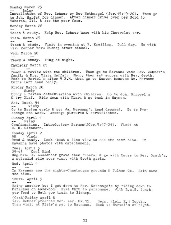 |   | "From the Prairie to the Pulpit" - Page 52 (1917 diary entries) Key Words for searching for this page: Rev. Zehner, Rev. Nothnagel, Joh. Harfst, Chevrolet car, H. Kreiling, Bishop, Havanna, Mrs. Clara Harfst, Rev. Groth, Bartel, Easton, William Hermann, John. Knuppel, Olaf, Clara, Haynes, D. H. Gethmann, Mrs. F. Lussenhof funeral, Sauer, Fulton County, Matauzas, Lakewoo This book was put together by George Mueller with journal entries from his father August G. Mueller. George was generous in allowing me to post this online. His work is being shared for personal use only. |