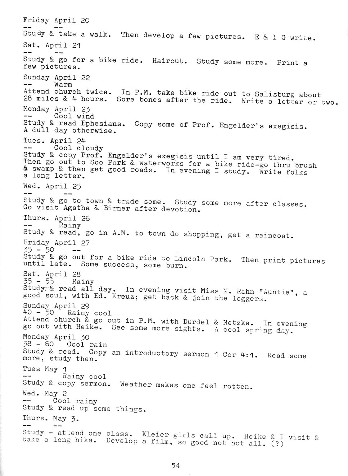 |   | "From the Prairie to the Pulpit" - Page 54 (1917 diary entries) Key Words for searching for this page: Salisburg, Prof. Engelder, Miss M. Rahn "Auntie", Ed. Kreuz, Durdel & Netzke, Heike, Kleier This book was put together by George Mueller with journal entries from his father August G. Mueller. George was generous in allowing me to post this online. His work is being shared for personal use only. |