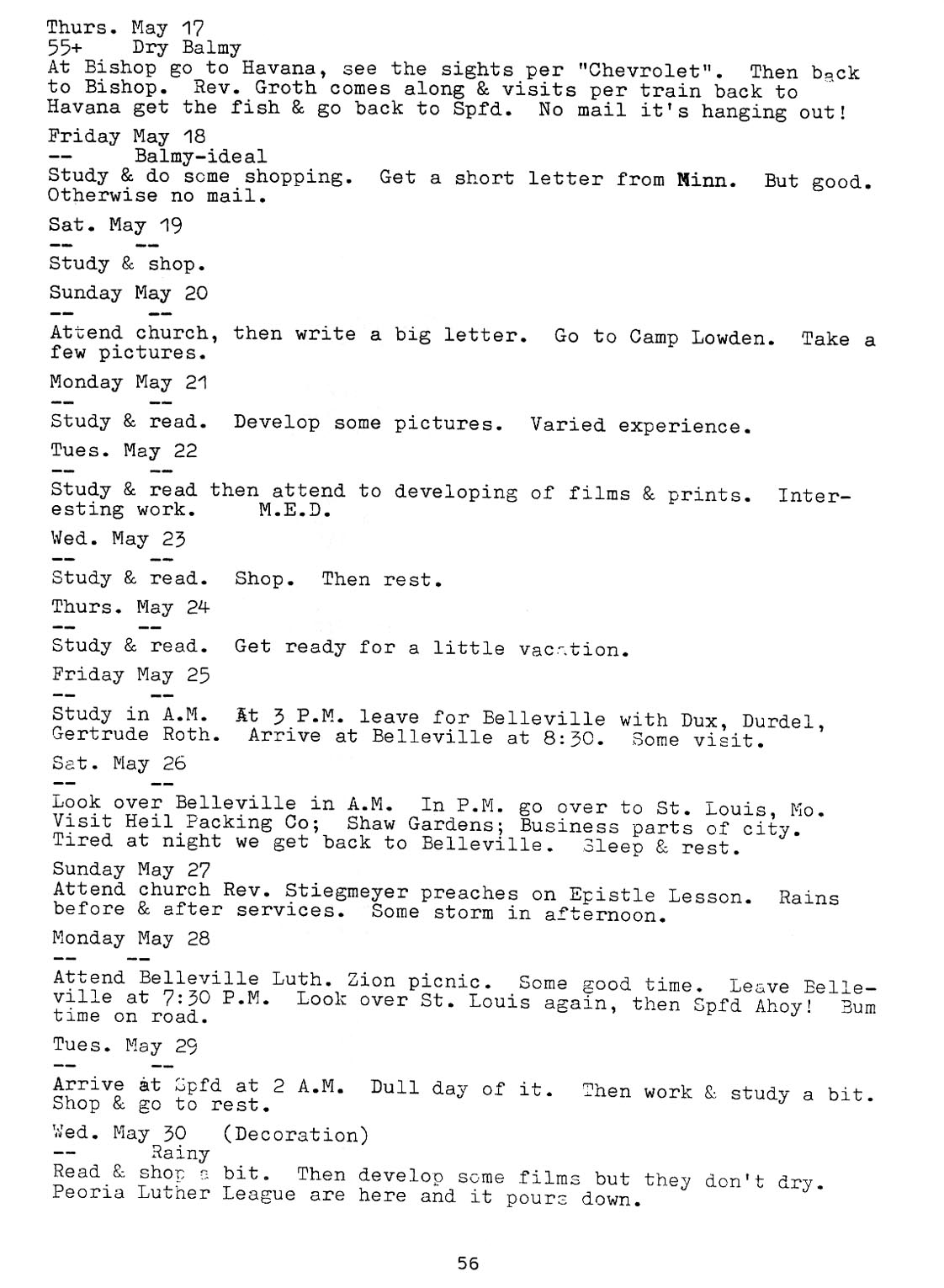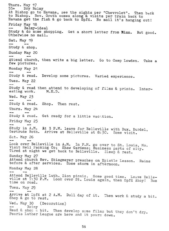|   | "From the Prairie to the Pulpit" - Page 56 (1917 diary entries) Key Words for searching for this page: Bishop, Havana, Chevrolet, Bishop, Rev. Groth, Camp Lowden, Belleville, Dux, Durdel, Gertrude Roth, St. Louis Missouri, Heil Packing CO., Shaw Gardens, Springfield, Peoria Luther League This book was put together by George Mueller with journal entries from his father August G. Mueller. George was generous in allowing me to post this online. His work is being shared for personal use only. |