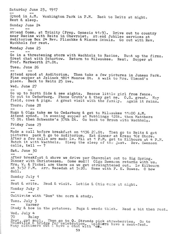 |   | "From the Prairie to the Pulpit" - Page 59 (1917 diary entries) Key Words for searching for this page: Reitz (25 Avenue), Rev. Plischke, Misses Schulz, Rev. Wachholz, Racine, Schartow, Milwaukee, Prof. Markworth (21 Street), Jelinck (1801 Monroe St.), Mrs. Ulmond, Cedarburg, Groth, Hugo & Olga Milwaukee, Nubblings (12 St.), Matthers (15 St.), Schwanke (37th St.), Braun, Waccholz, Kress 10 Cents Store, Kilbourn, Rev. Swenson, Big Spring, Christessen, Olga Swenson, Mrs. W. & Pickel, Necedah, F. E. Daws, Lottie, Otis, O. Strands, Holmville This book was put together by George Mueller with journal entries from his father August G. Mueller. George was generous in allowing me to post this online. His work is being shared for personal use only. |
