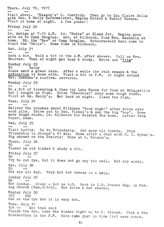 |   | "From the Prairie to the Pulpit" - Page 61 (1917 diary entries) Key Words for searching for this page: "Kasson's" C. Dietrich, Eau Claire Dells, Geo. & Emily Hafermeister, Regina Peters, Rudolf Tornow, Antigo, Rudie at Eland Junction, Regina, Camp Douglas, Kilbourn, Mrs. Wachholz, Schwarzewald boys, Mrs. Boelter, Rev. Swensen's confirm. services, Lake Mason, Briggsville, Wm. Henry, Geo. Pickel, Necedah, Cupar, Sask., Lottie, Friendship, Strand's, Chevrolet, L. Nelson This book was put together by George Mueller with journal entries from his father August G. Mueller. George was generous in allowing me to post this online. His work is being shared for personal use only. |