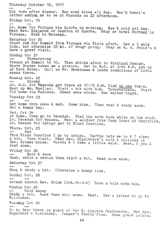 |   | "From the Prairie to the Pulpit" - Page 68 (1917 diary entries) Key Words for searching for this page: Viroqua via Sparta, Rev. Eikjarud, Cashton, Hotel Fortney, Necedah, W.W. Fruit, Summit, Richland Center, Scott Booker, Park Hotel, Mr. Bruetzuen, Muscoda, Wm. Mueller, tubercolosis, Walter Wight, Camp Grant, Stratford, Wausau, Antigo, Eland Junction, Antigo, Rev. Enelbreck, Rev. Grimms, Bear Creek, Rev. D. Jaegers Conference, Rev. Engelbert & Karpinsky This book was put together by George Mueller with journal entries from his father August G. Mueller. George was generous in allowing me to post this online. His work is being shared for personal use only. |