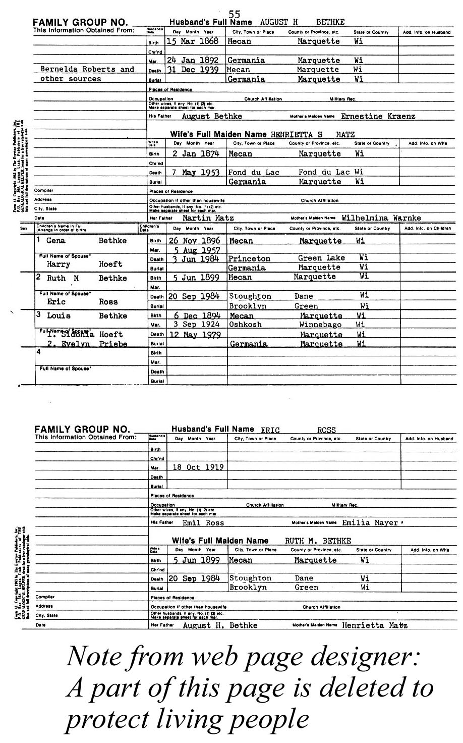 |   | "A Warnke Genealogy" - Page 55 Key Words for searching for this page: August H. Bethke; Mecan, Marquette County, Wisconsin; Germania; Mecan; Germania; August Bethke; Ernestine Kraenz; Ernestine Bethke; Henrietta S. Matz; Henrietta Matz; Fond du Lac; Martin Matz; Wilhelmina Warnke; Wilhelmina Matz; Gena Bethke; Harry Hoeft; Gena Hoeft; Princeton, Green Lake County; Ruth M. Bethke; Eric Ross; Ruth Ross; Stoughton, Dane County; Brooklyn, Green County; Louis Bethke; Sidonia Hoeft; Evelyn Priebe; Sidonia Bethke; Evelyn Bethke; Oshkosh; Eric Ross This book was written by Orlan Warnke. He was generous in allowing me to post this online. His work is copyright protected and is being shared for personal use only. No commercial use is allowed. |