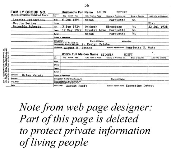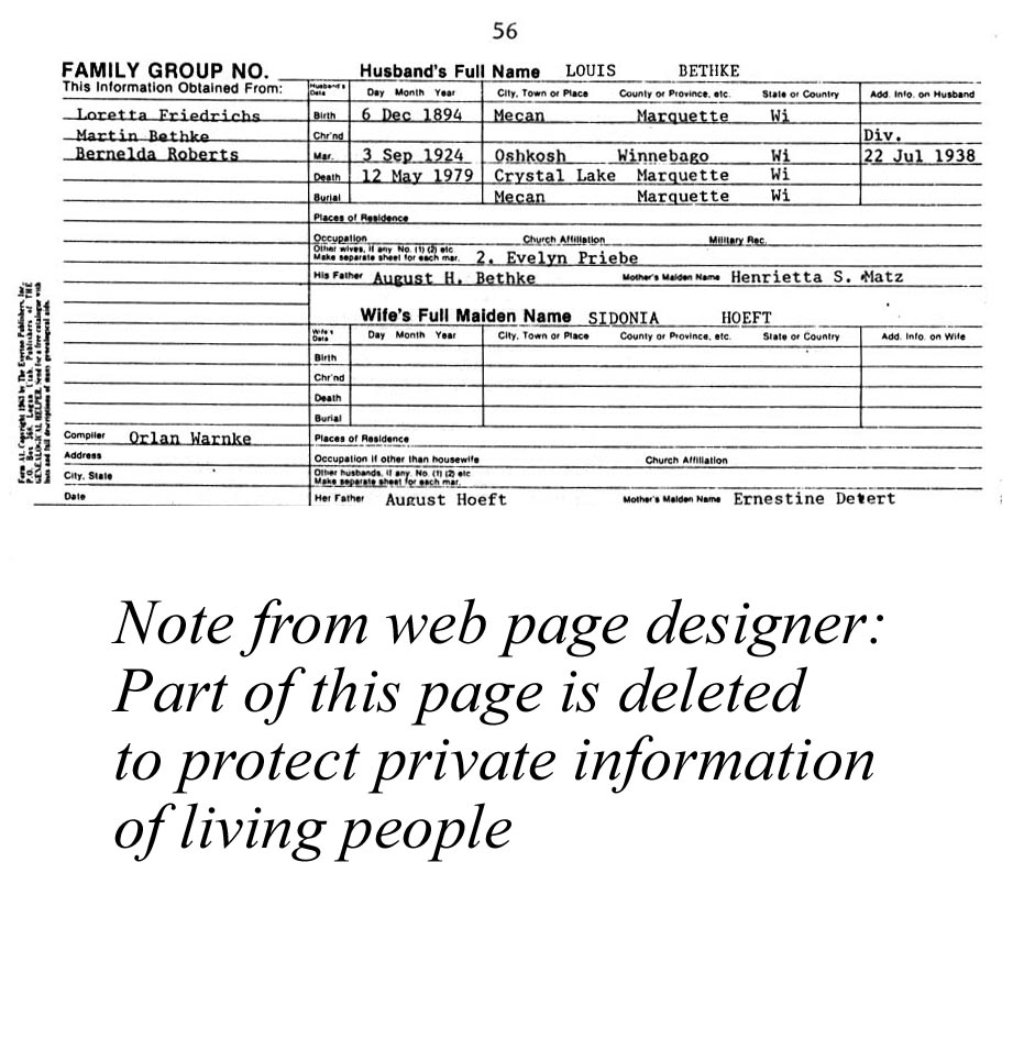 |   | "A Warnke Genealogy" - Page 56 Key Words for searching for this page: Louis Bethke; Mecan, Marquette County, Wisconsin; Oshkosh, Winnebago County; Crystal Lake; Mecan; Sidonia Hoeft; August Hoeft; Ernestine Detert; Ernestine Hoeft; Sidonia Bethke This book was written by Orlan Warnke. He was generous in allowing me to post this online. His work is copyright protected and is being shared for personal use only. No commercial use is allowed. |