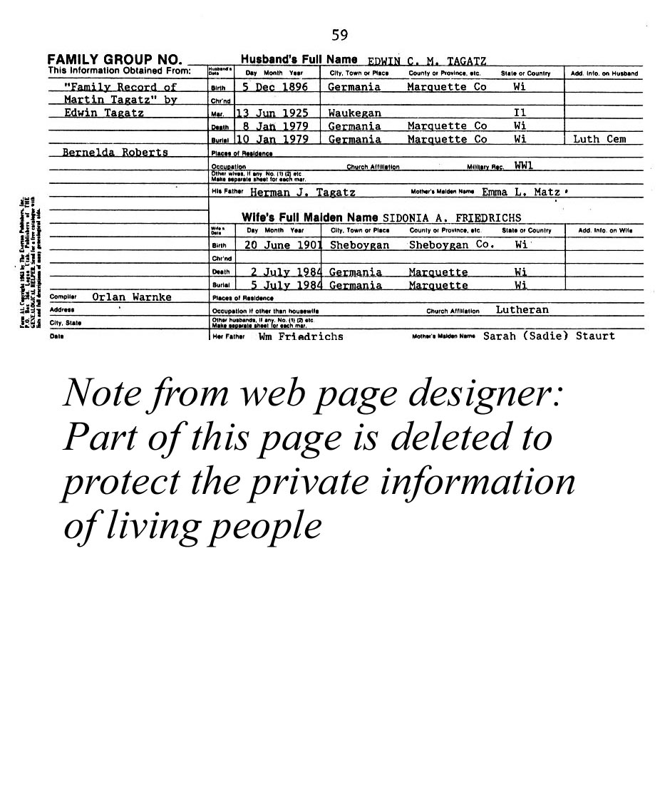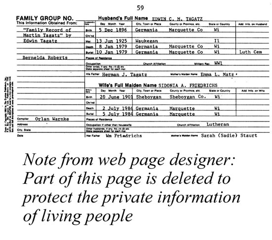 |   | "A Warnke Genealogy" - Page 59 Key Words for searching for this page: Edwin C. M. Tagatz; Germania, Marquette County, Wisconsin; Waukegan; Herman J. Tagatz; Herman Tagatz; Emma L. Matz; Emma Matz; Emma Tagatz; Edwin Tagatz; Sidonia A. Friedrichs; Sidonia Friedrichs; Sheboygan County; William Friedrichs; Sarah Stuart; Sadie Stuart; Sadie Friedrichs This book was written by Orlan Warnke. He was generous in allowing me to post this online. His work is copyright protected and is being shared for personal use only. No commercial use is allowed. |