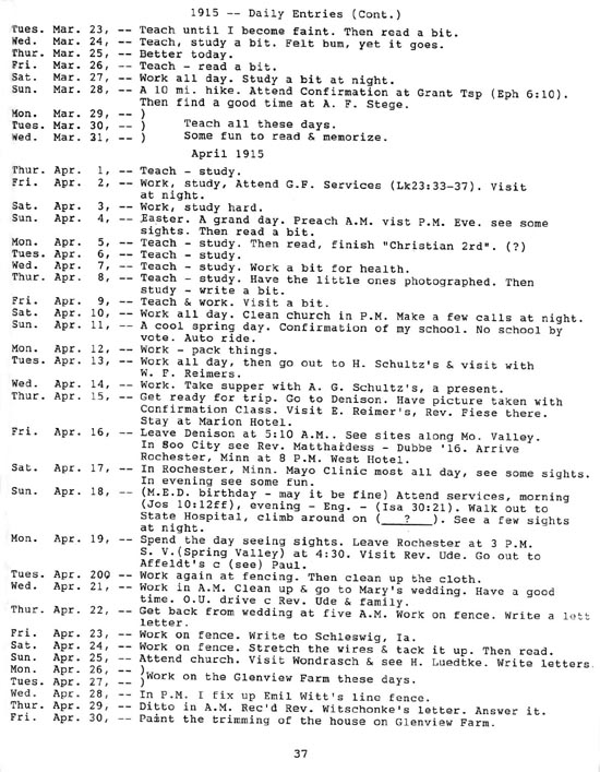 |   | "From the Prairie to the Pulpit" - Page 37 (1915 diary entries) Key Words for searching for this page: A. F. Stege, H. Schultz, A. G. Schultz, Denison, E. Reimer, Rev. Fiese, Rev. Matthardess, Rochester, Minnesot, Mayo Clinic, Rochester, Rev. Ude, Affeldt's, Schleswig, Iowa, Wondrasch, H. Luedtke, Glenview arm, Emil Witt, Rev. WItschonke, Glenview Farm This book was put together by George Mueller with journal entries from his father August G. Mueller. George was generous in allowing me to post this online. His work is being shared for personal use only. |