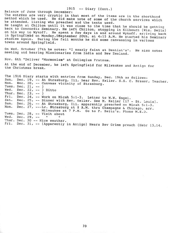 |   | "From the Prairie to the Pulpit" - Page 39 (1915 diary entries) Key Words for searching for this page: Chilton, Kilbourn (Wisconsin Dells), Wykoff, Springfield, Milwaukee, Antigo, Stasburg, Illinois, Rev. Keller, S.S.C.Brauer, M. Keller, Rev. Grimm This book was put together by George Mueller with journal entries from his father August G. Mueller. George was generous in allowing me to post this online. His work is being shared for personal use only. |