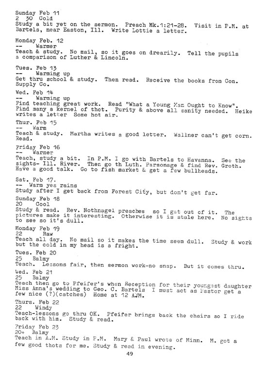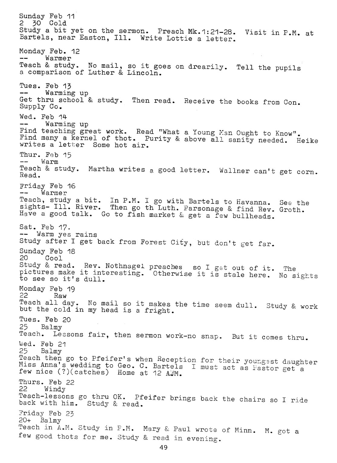 |   | "From the Prairie to the Pulpit" - Page 49 (1917 diary entries) Key Words for searching for this page: Bartels, Easton, Illinois, Havanna, Rev. Groth, Rev. Nothnagel, Pfeifer, Miss Anna's wedding to Geo. C. Bartels This book was put together by George Mueller with journal entries from his father August G. Mueller. George was generous in allowing me to post this online. His work is being shared for personal use only. |