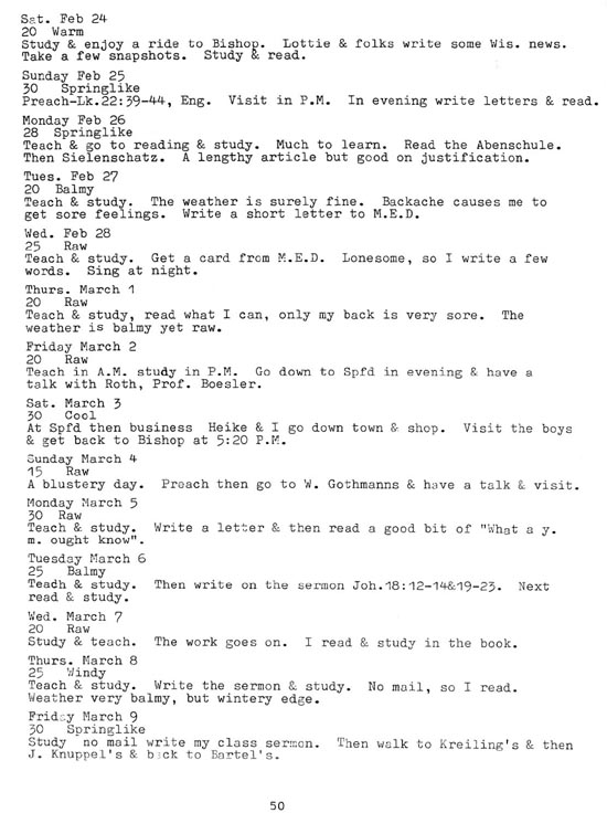 |   | "From the Prairie to the Pulpit" - Page 50 (1917 diary entries) Key Words for searching for this page: Bishop, Abenschule, Sielenschatz, Prof. Boesler, Springfield, Heike, W. Gothmann, Kreiling, J. Knuppel, Bartel This book was put together by George Mueller with journal entries from his father August G. Mueller. George was generous in allowing me to post this online. His work is being shared for personal use only. |