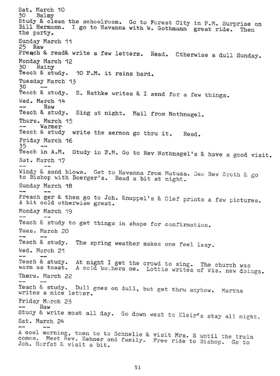 |   | "From the Prairie to the Pulpit" - Page 51 (1917 diary entries) Key Words for searching for this page: Forest City, Bill Hermann, Havanna, W. Gothmann, S, Rathke, Rev. Nothnagel, Matuza, Rev. Groth Boerger, Bishop, Joh. Knuppel, Olef, Kleir, Rv. Zehner, Schnelle, Joh. Harfst This book was put together by George Mueller with journal entries from his father August G. Mueller. George was generous in allowing me to post this online. His work is being shared for personal use only. |