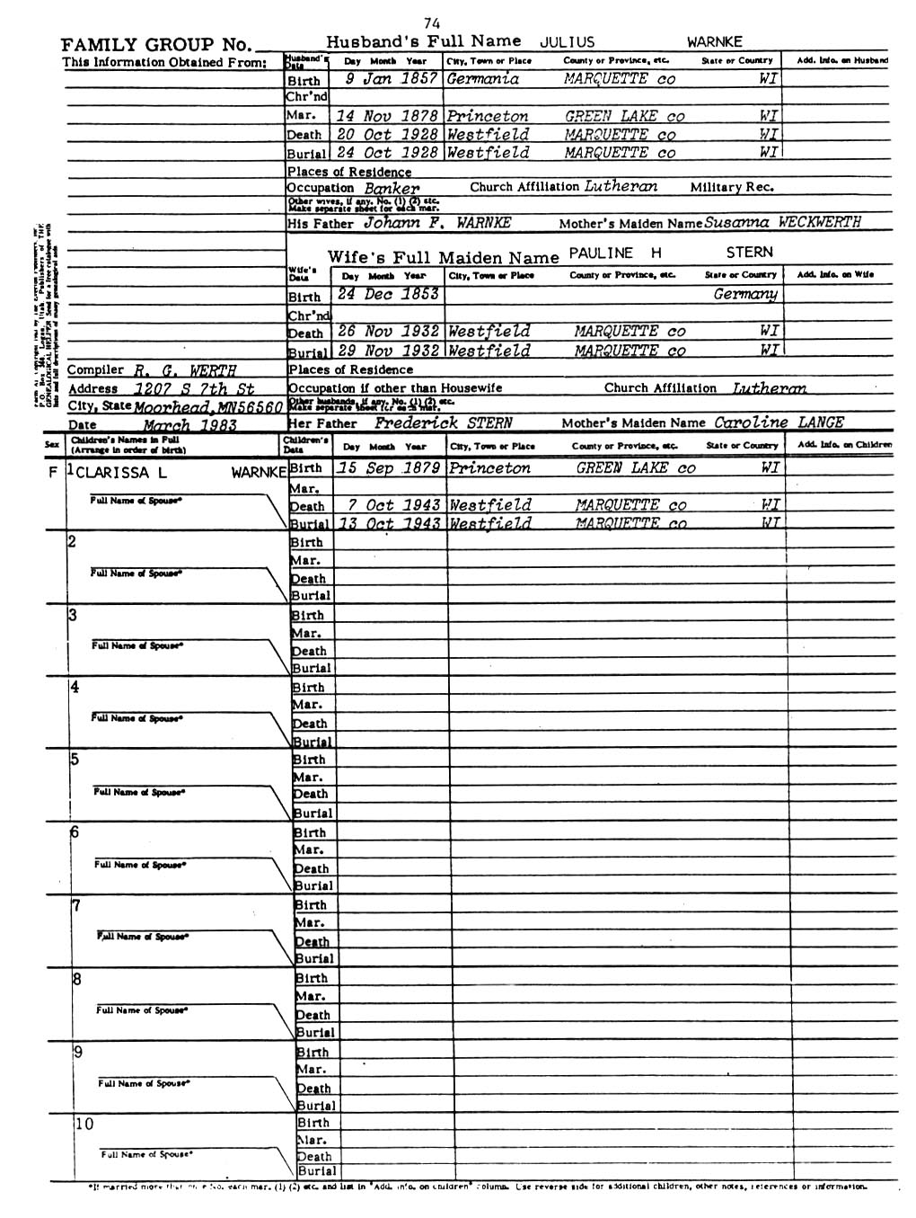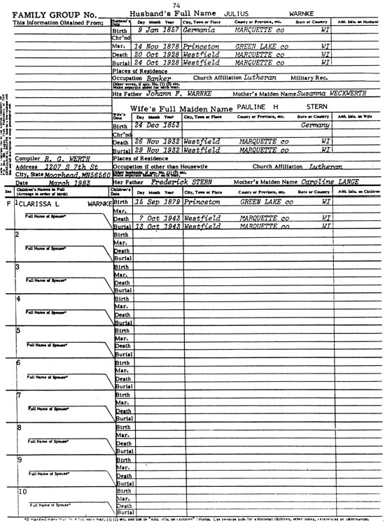 |   | "A Warnke Genealogy" - Page 74 Key Words for searching for this page: Julius Warnke; Germania, Marquette County, Wisconsin; Princeton, Green Lake County; Westfield; Johann F. Warnke; Johann Warnke; Susanna Weckwert; Susanna Warnke; Paulina H. Stern; Paulina Stern; Germany; Frederick Stern; Caroline Lange; Caroline Stern; Clarissa L. Warnke; Clarissa Warnke This book was written by Orlan Warnke. He was generous in allowing me to post this online. His work is copyright protected and is being shared for personal use only. No commercial use is allowed. |
